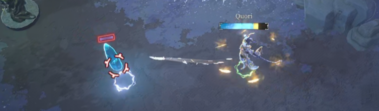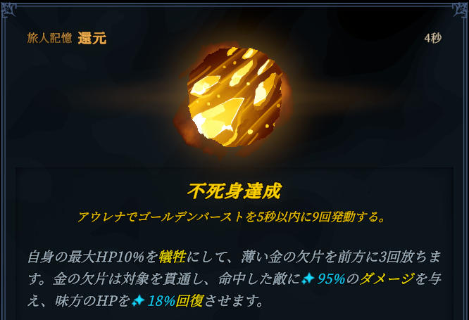 遠距離から直線状に貫通攻撃しつつ、味方を攻撃する記憶です。意外にも攻撃的な記憶で、クールダウン4秒で 95% x 3 は序盤でかなり頼りになる性能をしています。ただ、遠くまで届きますが幅は全然ないので、クリーンヒットさせるために敵を誘導することも大事になってきます。敵がアウレナに対して横に動くと外れることも多いのでそこも気を付けていきたいですね。