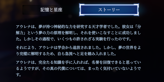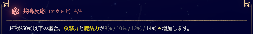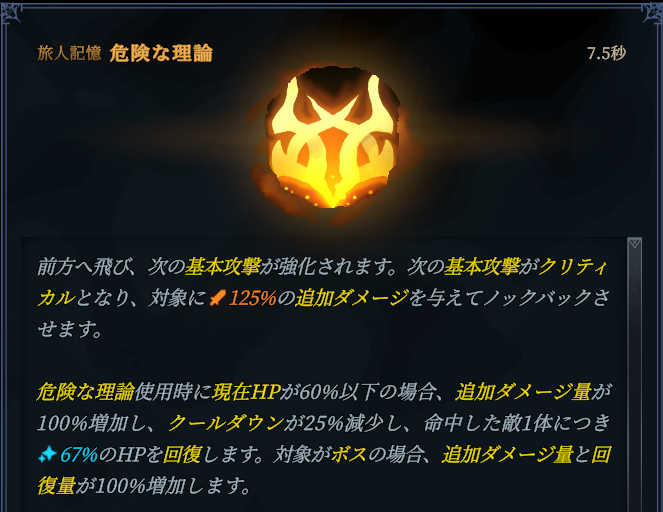 危険な理論の大きな変化があった点としては、星座(スキルツリー)が実装されたことで、星による記憶自体を強化・性能変化できるようになったこともありますが、アウレナ固有の星でHP一定値以下になると強化される星が複数追加されたことで、HP減少時の立ち回りがしやすくなったことです。
