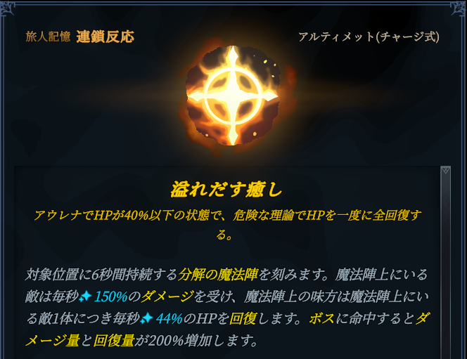 回復については、美しい脅威の追加回復効果と合わせると安全な位置から味方を回復できるのが特徴になります。しかし注意点があり、還元単体性能で回復させるのは味方だけ(アウレナ自身は回復できない)・遠すぎる味方は回復できない・回復効果は攻撃ヒット時のみ、という点です。回復範囲は検証中ですが、おそらくアウレナ自身からの距離ではなく攻撃がヒットした場所からの距離だと思われます。回復するためには、敵の近くに味方がいなければいけないので注意しましょう。
