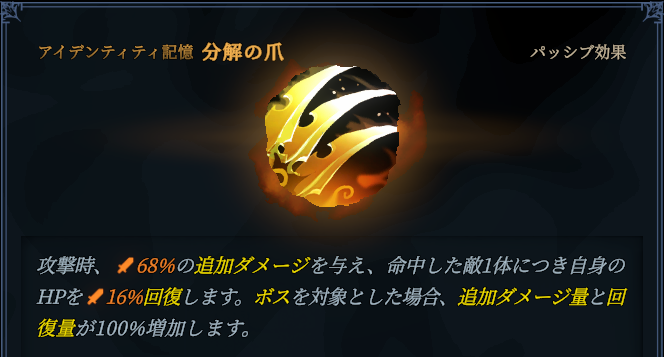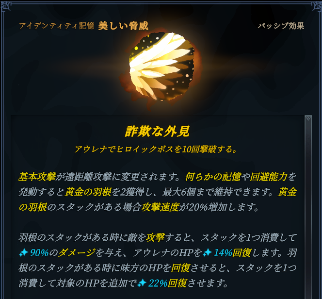 近距離か遠距離のどちらかを選択できるようになりました。現状どちらもできるのはアウレナの特権となっています。近接なら分解の爪、遠距離なら美しい脅威を選びましょう。各々のアイデンティティ記憶の詳細は後述しますがおおざっぱに分けると、自己回復力と範囲攻撃の分解の爪・味方回復と安定性の美しい脅威、という形です。悩んだらとりあえず美しい脅威がオススメです。