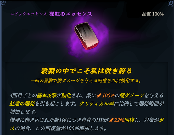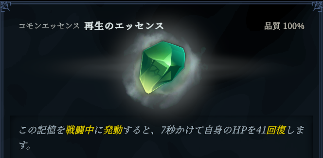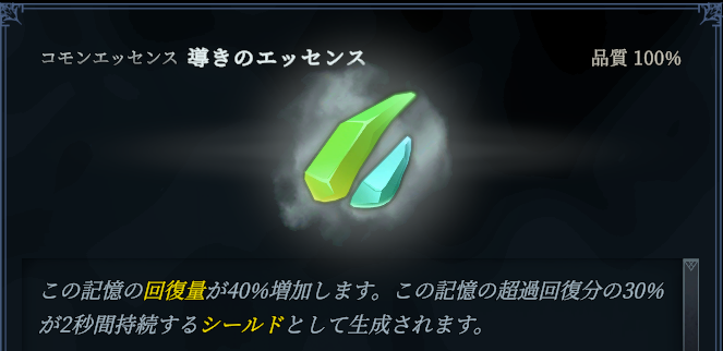 回復運用をメインにしていくのであれば、回復量をあげる効果のある導きのエッセンスやDemo版から引き続き被ダメージ時に自動発動する復讐のエッセンスあたりがオススメです。