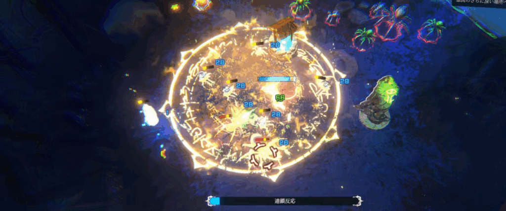 注意点としては、魔法陣上の敵にしか効果を発揮しないので、魔法陣の上におびき寄せる必要があることです。そのため、連鎖反応を運用する基本は、発動した魔法陣上に自分が乗ることです。どんな敵であってもある程度は近づいてきますので、うまく引き付けましょう。ただ、それでも効果を発揮しづらい敵はいて、特に世界「夜空の夢」、世界「浸食された絶望の島」は遠距離攻撃をしてくるザコがなかなか近づいてきません。おびき寄せる以外にも魔法陣上から攻撃して倒してしまったりすることも大事になってきます。