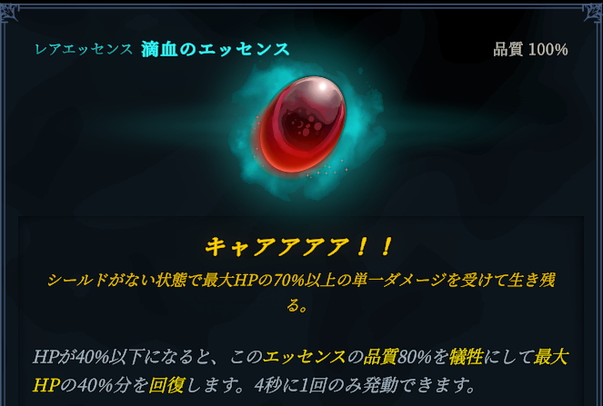 滴血のエッセンス:HP40%以下時に品質80%使用して緊急回復