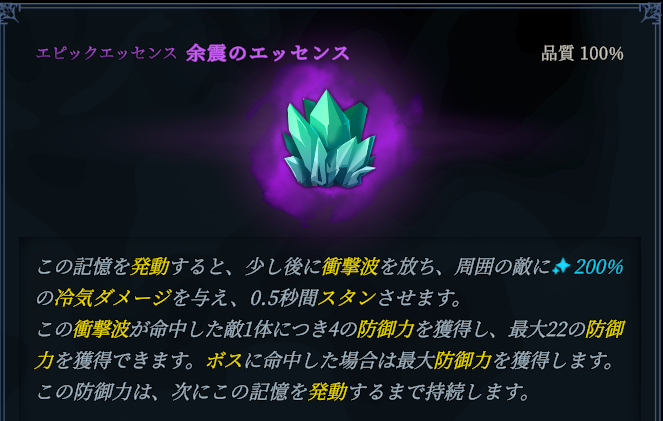 立ち回り方針:防御寄り。余震のエッセンスで防御力を上げしぶとく戦う。