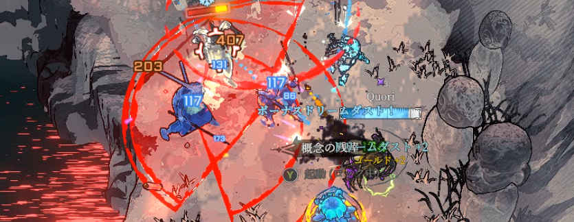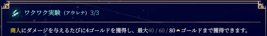 Demo版では、序盤から終盤までずーーーっと商人のお世話になるためゴールド=パワー、でしたが、ゴールドの利用用途の増加・商人の弱体化のため正規版では必ずしもそうではなくなりました。しかし、序盤に関して言えば、記憶・エッセンス集めのために商人を周ることが最優先になります。星座にてゴールドも集めやすくなっているので富のエッセンスがなくて苦しい…ということだいぶ減りました。アウレナの場合は星座「ワクワク実験」や連鎖反応の星座「錬金術の権威」で序盤でもゴールドを稼ぎやすい設計になっているのがありがたいですね。