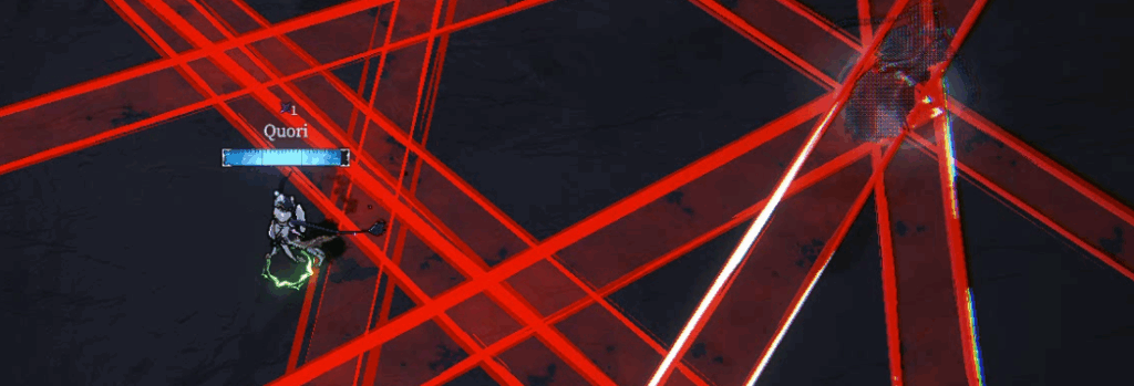 ⑥第二形態 連続十字雷撃:プリムスが中央に移動し四方に①のように直線状に雷撃を落とします。かなり早いこと、単発の火力も高いこともさることながら、場所によっては連続ヒットすることから、ここで死にやすいです…。惜しむことなく回避を使いましょう。