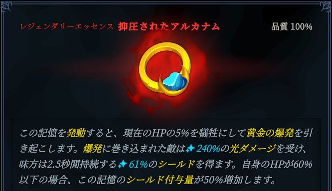こちらがアウレナ関係のエッセンスの抑圧されたアルカナムになります。性能はゴールデンバーストと似た性能ですね。この装飾品がアウレナが研究していた”禁断の知識”に関係するものなのでしょうか。気になります。