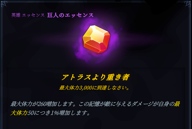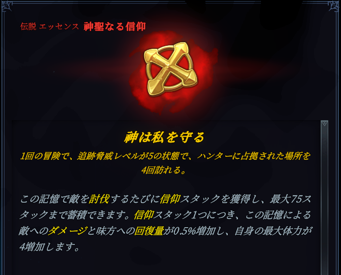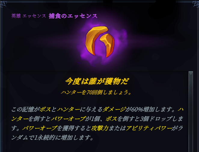 • タグ:バフ(ダメージ / ボス特攻 / ハンター特攻)、永続攻撃力増加、永続アビリティパワー増加