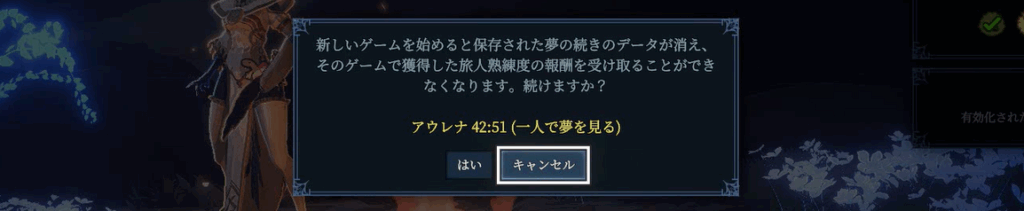 ちなみに、中断データがある状態で通常通りゲームを開始しようとすると注意喚起のダイアログも表示されます。序盤で何かしらのミスをしてデータを消す際などはこちらからになります。