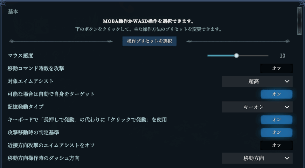 • 操作プリセットを選択:MOBA・WASD操作の切り替え